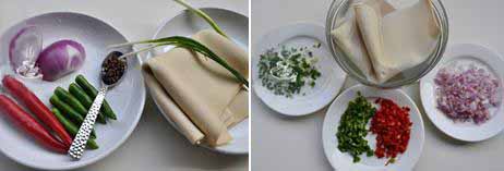 材料:豆腐皮(也叫千张)1张、洋葱小半个、红、青尖椒适量、花椒粒1小勺、小葱2-3根