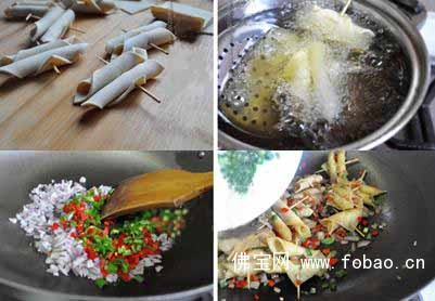 3、将豆皮控干水分,分切成小方块,卷成筒状用牙签串起来;