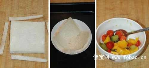 取一个小碗,把土司轻轻按下去贴着碗边,让土司成碗型。这时候你可以先刷牙洗脸,牙刷好脸洗好,烤箱也预热好了。把放了土司的碗入烤箱,时间设定在五分钟左右