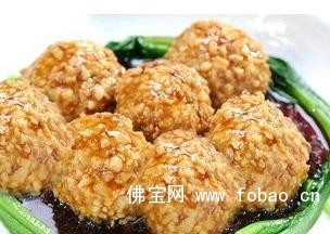 3、将1、2拌在一起,揉成球状,滚面包糠,炸金黄色起锅,即成狮子球。