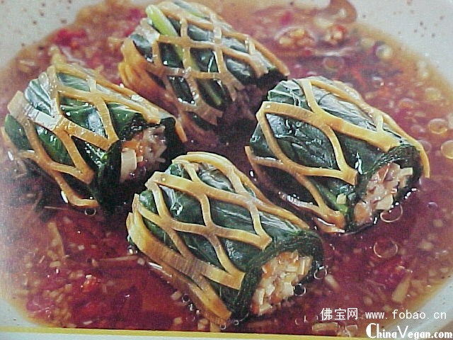 3、菠菜叶放进滚水中烫6-8秒,取出,冲冷水,再用干布吸干水分,一层 一层地铺 好(约15公分长,10公分宽),将炒好的各丝状馅料铺入,卷起 ,扎实,切大段摆盘 ,表面用红萝卜交叉排列点缀。