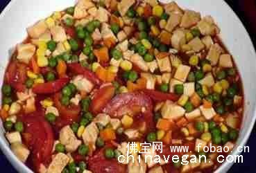 材料:板豆腐2 块、蕃茄300 克、三色豆(青豆、玉米、胡萝卜)100 克