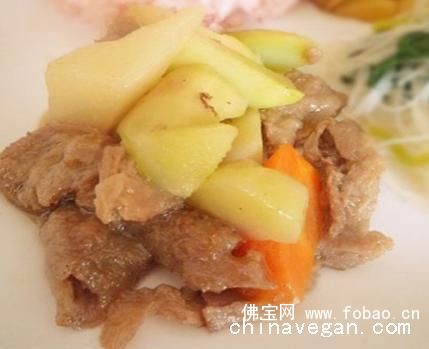 3、锅中加适量水、盐、生抽、糖、与素牛肉一起大火烧开后,改小火加盖炖至土豆熟即可。