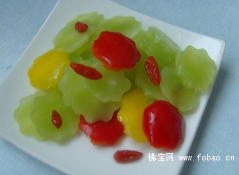 1、莴苣与甜椒用具刀刻制成花形薄片(如图)