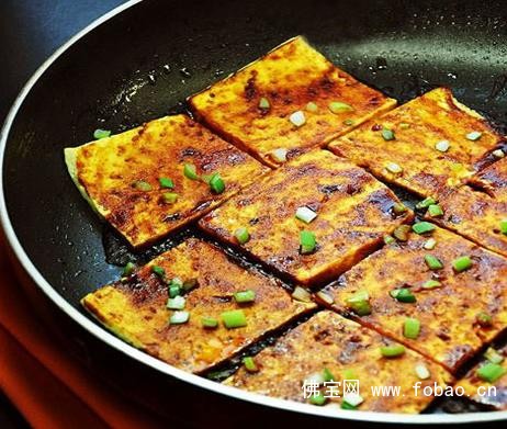 3、将豆腐双面煎黄,要用小火。翻面。