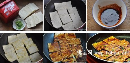 1、豆腐切成大而薄的块状。放进平底锅中小火煎制,锅里薄薄的摸层油。