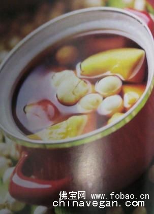 3、 莲子、番茄沙司,放入清水中煮沸,转文火煲30分钟;