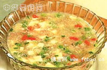 3、起油锅,投入葱(切段)段,煸炒,放入素高汤及清水500克,滚起捞出葱段,不用,倒入豆腐及素火腿丁、罗汉笋丁、香菇丁、青豆、滚起用湿淀粉50克(淀粉35克加水)勾芡,再放入西红柿丁、浇上明油,起锅装汤盆撒上葱花即可。