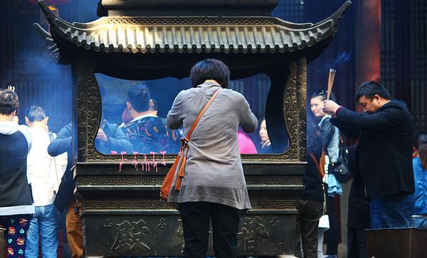 5、点香时不可用口吹火熄。将香插好后,退半步问讯即可,不用一直点头。