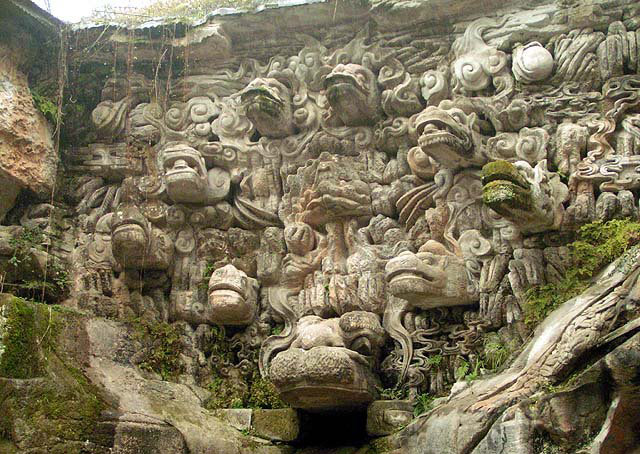 大足石刻 九龙浴太子图宝顶山:九龙浴太子图。描绘释迦降生时九条天龙为其沐浴场景,这九龙下方还有人物雕刻。这个地方本来是山岩雨水出口处,雕刻家因地制宜,通过复杂的管道将雨水引到最下方的龙头泻出,十分巧妙。