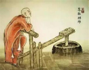 大约是惠能30岁的时候,即公元667年(唐高宗乾封二年),他偶然于市卖柴,听到一客诵《金刚经》,一闻经语,心即开悟。从此,他与佛教结下了不解之缘。他安置了老母,毅然只身离开家乡,寻访佛法,最后来到湖北黄梅东山,参礼五祖弘忍,作了他门下的一个服舂的苦役人。8个月后,又意外地被弘忍选为传法人,成为中国禅宗的第六代祖。