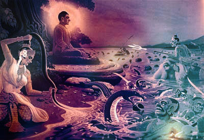 (无论魔王和魔军以什么方法,都无法伤害菩萨一发一毫,菩萨终以大威德力击溃降伏魔军)