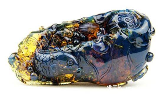 另外,蓝珀的价值除了颜色之外,还有加工、通透度、内涵物的区别,所以不能仅凭颜色判断价值。一块好的多米尼加蓝珀料子,无论是圆珠、裸料还是雕刻件。体净无杂质,白底透光看为蛋清色,上手的话就能看到淡淡的紫蓝隐含色,黑底下光一强,就瓦蓝瓦蓝的了。这是好蓝珀的标准。成色级别向下看的话,内含杂质的多少是一个标准,杂质越少越好。植物、动物不属于杂质,有就更贵了。