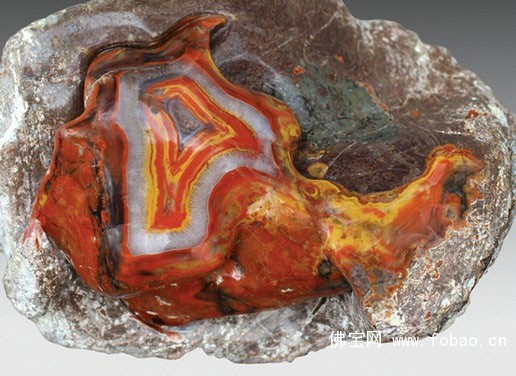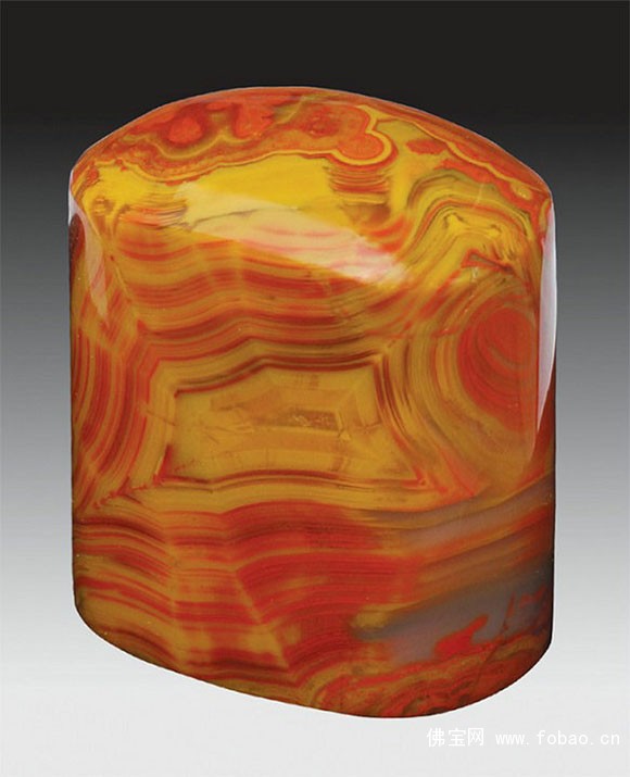 战 国红玛瑙同时兼具了玛瑙顶级的色和丝两种特点。其丝为红黄色,丝间的过渡色则有红、黄、绿、紫、无色等多种。而各色在色谱上均有很宽泛的过度,黄色从土黄 到明黄,红色从暗红到血红。如此之多的颜色和复杂的缠丝相结合,形成了战国红千变万化的特点,可谓极尽自然变化之能事。雪花向人类展示了水气凝结时的曼妙 多姿,战国红则向我们呈现了岩浆涌入岩石缝隙时的无穷变化。