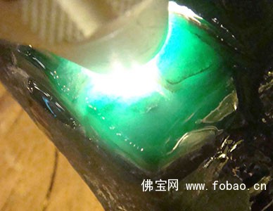 照:在强光或阳光下,用不透明的金属卡片或灯照,观察皮壳四周及内部的色调,绿色的走向,光泽的变化,反光的强弱。真原石色调艳丽自然,绿色的走向清楚,光泽强,反光亮,与周围部分呈渐变关系假原石色调灰淡,不自然,绿色的走向无规律,光泽弱,反光暗,与周围部分关系截然。