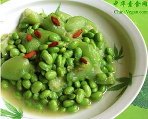丝瓜可清火、美容、去除脸上的黑斑。毛豆含有丰富的蛋白质,枸杞子也可以补气、美容。此款菜肴为上海时令美食。品尝美味的同时感受上海江南风情.
