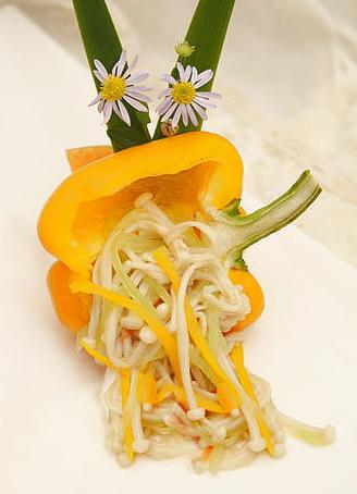材料:金针菇150克、莴笋100、红椒1个、黄甜椒1个