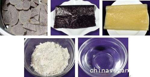 芋头300公克(切片蒸熟)、海苔片2张、腐皮1张、中筋面粉3大匙、水2大匙(见下图)
