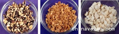 香菇 20公克(泡水后切细丁)、素肉切细丁100公克、杏鲍菇切小丁60公克、盐 1/4茶匙、酱油1/2茶匙、糖1/2茶匙、天然味素1/2茶匙
