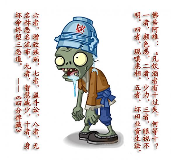 《大爱道比丘尼经》 “夫酒为毒药,酒为毒水,酒为毒气。众失之原、众恶之本。残贤毁圣,败乱道德,轻毁致灾,立祸根本,四大枯朽,去福就祸,靡不更之。宁饮焬铜,不饮酒味,所以者何?酒令人失志,迷乱颠狂,令人不觉,入泥犁中。”