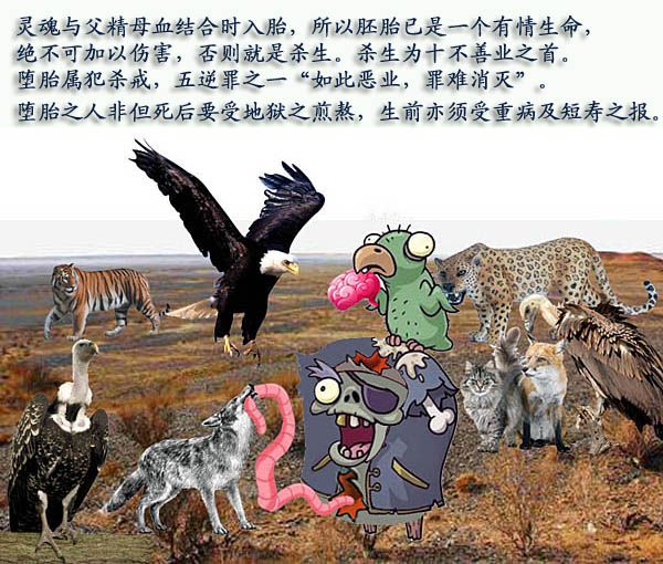 宣化上人: 现在最要紧的是世上不知有多少小鬼,为什么有这么多小鬼?就因为人堕胎太多了,它还没长成人形就把它杀了。小鬼的报复心更重,所以戒杀、放生也包括不可以堕胎。这些小鬼很不容易摆脱,所谓“阎王好见,小鬼难缠。”所以各位要注意这一点。现在全世界每个国家小鬼比大鬼多,大鬼比老鬼多,这种问题是很严重的。这个因果报应是丝毫不爽的,我们人切记不要杀生。你杀他,他就杀你,那么互相杀,没有完了的时候。