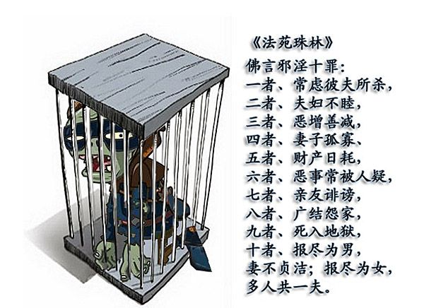 “自己有妻室却不知满足,喜欢淫乱他人妻女。这样的人已丧失惭愧心,必将受尽苦难,没有任何快乐。”——《萨遮尼乾子经》