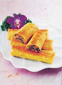 ②将馅料分成8份,用腐皮将馅料包成春卷状,用面糊黏好腐皮。