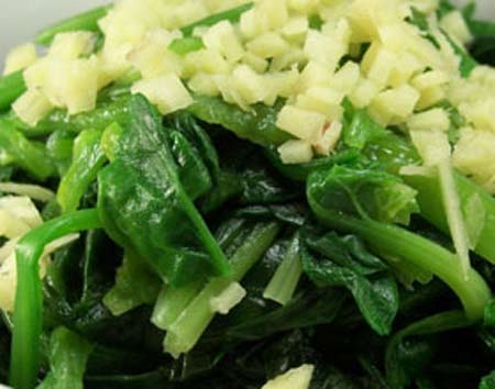 2、生姜洗净去皮,切碎,捣烂,加入精盐、白糖、食醋、味精,拌匀后倒在菠菜上,淋上香油,拌匀即可食用。