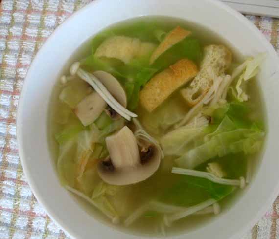 先把姜拍几下,扔到汤锅里。再把圆蘑菇切片,豆付泡切片也放到锅里大火煮,差不多熟了要放盐和金针茹,最后再放切好的圆白菜。等圆白菜煮软了就可以关火后,再放入胡椒粉和香油。喜欢吃羹的朋友可以调好芡放入。