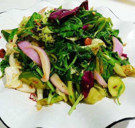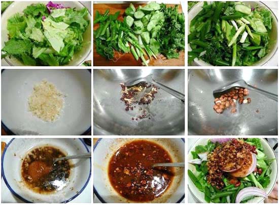 6、先将麻酱澥开,再加鲜酱油、盐、香油、白糖、香醋、红油等调匀后浇在蔬菜上,拌匀即可食用。