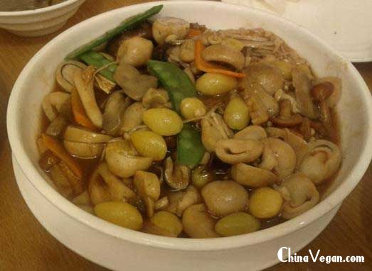 白果、草菇(罐头),金针菇、滑子菇、荷兰豆、胡萝卜、素高汤半杯,素蚝油、盐、淀粉少许,植物油2大汤匙。