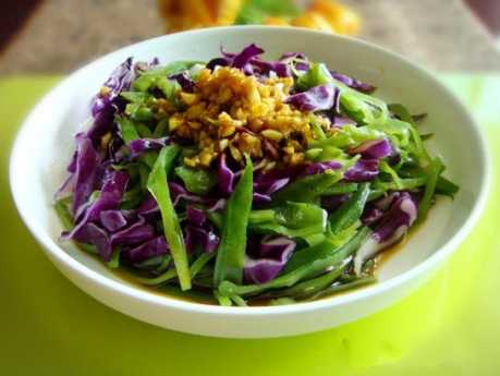 材料: 紫甘蓝4片、扁豆15个、油、盐、酱油、醋、白糖、花椒、蘑菇精、蒜各适量