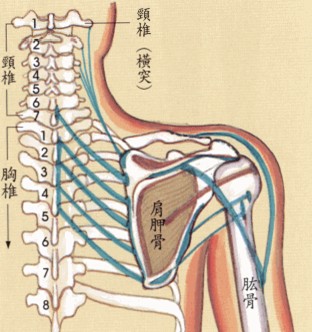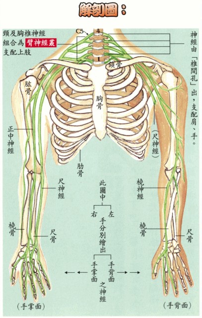 ·由右图左右手,可了解整个上肢神经,追溯其来源,是由‘颈椎’(4、5、6、7)及‘胸椎’之间的‘椎间孔’出来(会合为臂神经丛)。亦即颈椎第5、6、7、8对神经,和第一胸椎的神经,支配肩部和手,而平日仰头之动作常会压迫这些神经,故造成肩酸痛、手麻、无力。