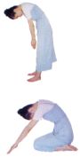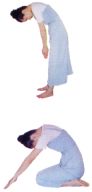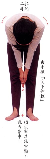 ·将肩自然松、落(如掉下般),又合掌下垂于中线(端正而松柔),合掌之手,沿中线,再往下伸拉一些,(上身不动,肩、肘松),可将二肩胛骨,拉得更开阔、更舒服。使平日已紧绷缩短的肌肉,韧带都拉长,拉松。