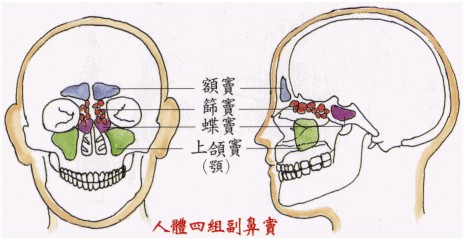 我们常听说‘鼻窦炎’,而很少人知道‘鼻窦’在哪里,人体有四组‘副鼻窦’,如图示: