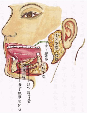 ·以上唾液腺之‘导管、开口’,几乎就全部闭塞(被夹紧了)于是会缺乏唾液,不但口干舌燥,而且缺乏消化酵素,易致消化不良,同时会缺乏抗体,免疫力降低,故宜放松,不宜咬牙切齿。(但上下唇合)