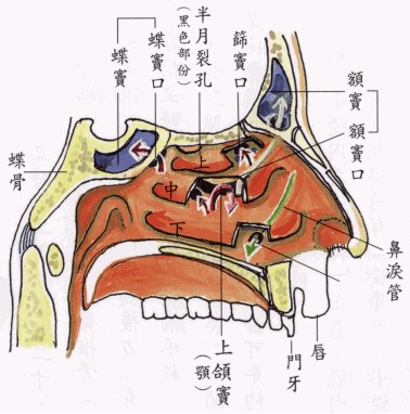 下图是由正中线、直剖,观察左半边之鼻腔和鼻窦及鼻窦口。