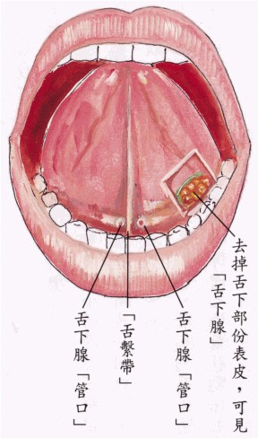 张开口,将舌尖顶于上齶,(齶,音ㄜˋ。为‘齿内上下肉也’。)可见舌下正中,有一‘舌系带’,‘舌系带’两旁,各有一小‘管口’,有唾液涌出,图上绿色小管是另一‘颌下腺’之导管,它也会入舌下腺之管口。