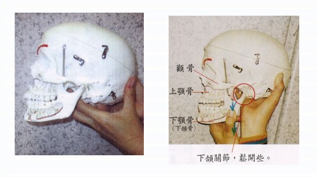 咬牙与放松,牵涉到下颌关节的松、紧、开、合。(注:颧ㄑㄩㄢˊ,颚ㄜˋ)