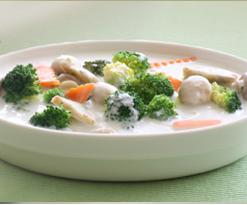 3、高汤中加入鲜奶油、盐、胡椒粉、肉桂叶、百里香、椰奶,煮滚后再把适量白酱加进去,搅拌至略为浓稠。