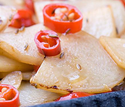 3、锅里放少许油,放入辣椒圈,蒜片,煸炒出香味后,放入土豆片,加入生抽一勺、一勺、放少许水,翻炒一下,小火盖盖闷一下,放一大勺孜然粒,翻炒一下,熟了以后,收干汁,加盐出锅。