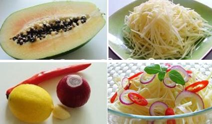 青木瓜、洋葱、红椒、纯素沙拉酱、(用美极鲜汁也可以)大蒜、泰式甜辣酱、柠檬、糖