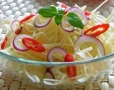 2、 将青木瓜用纯素沙拉酱、(或者美极鲜汁)柠檬汁、蒜泥、甜辣酱、糖搅拌均匀后,加入洋葱及红椒圈即可。