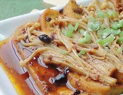 金针菇200克、豆腐(南)50克。盐3克、蘑菇精1克、酱油15克、香油5克。