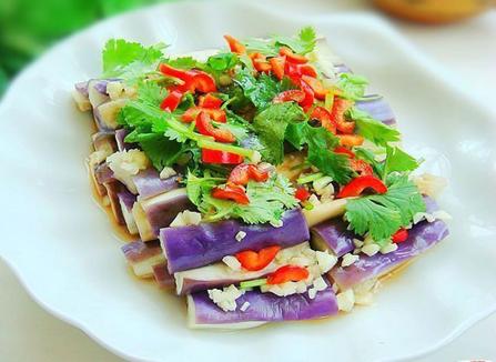 4、蒸好的茄子,加入蒜泥,香菜碎,香油,生抽,醋、盐,味精拌匀即可。