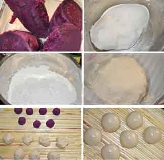 3、紫薯馅、糯米团分成相同数量的等份,团成小球;