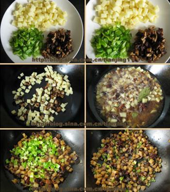 5、锅里放油,放入香菇和土豆煸炒,再添加清水,和所有调料,水量没过蔬菜即可。大火烧开后,转小火闷至材料软烂,还剩下一些卤汁,再放入青椒翻炒即可。我煮的稍有些干了。