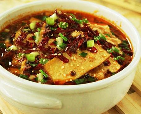 3.热锅放油,下入郫县豆瓣与八角、桂皮、花椒,小火将其炒出红油后再下入干辣椒与姜蒜,炒出香味后舀出一半的辣椒待用;