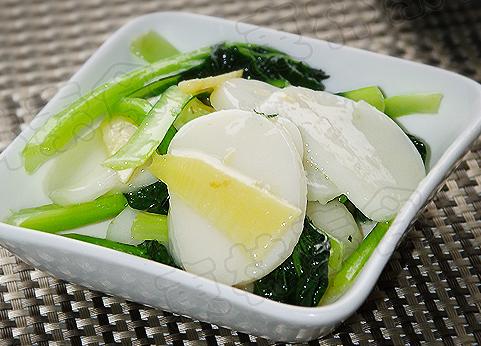 (5) 锅内加入少许植物精制油, 放入塌棵菜煸炒,软身后加水(水略微多些,约一杯水)、放入滑过油的冬笋、年糕,略微煮一会儿。加盐、素易鲜(代替味精) 收卤汁不勾芡, 出锅装盘即可。
