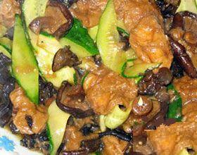 6、再下入面筋块,待面筋烧透,再下入鲜笋片、香菇丝和青菜段,以湿淀粉勾芡即成。